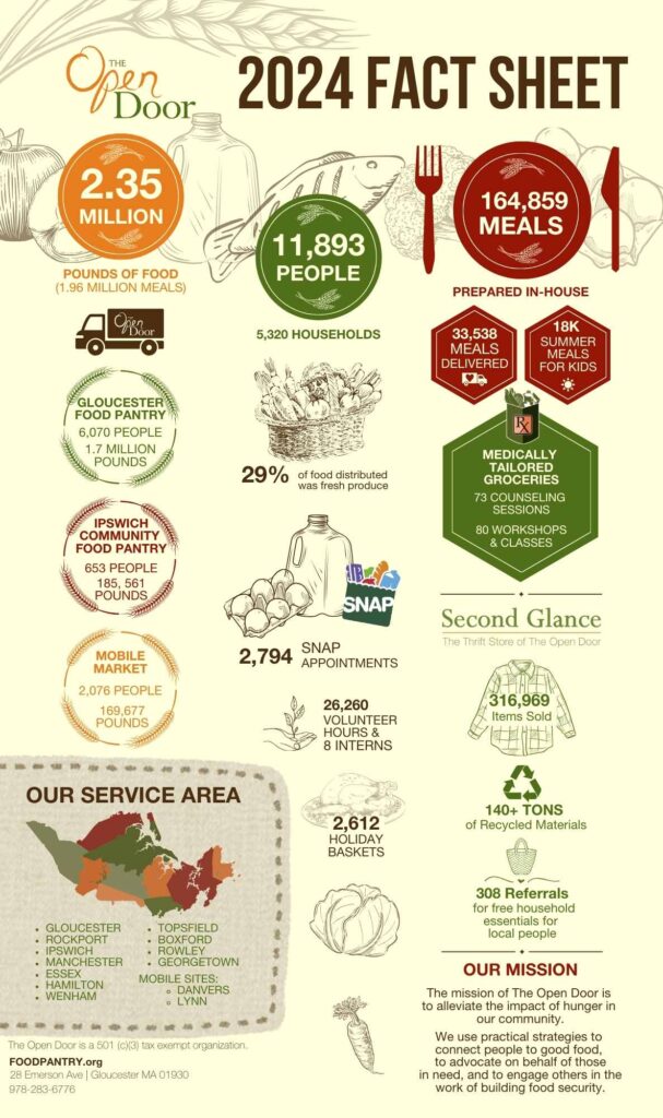 All volunteer Ipswich Food Pantry merges with The Open Door and forms our new satellite Ipswich Community Food Pantry at Agawam Village to expand service area from 5 to 10 communities.